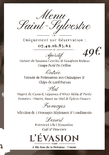 | Le 31/12/2025 à Traves Menu de la Saint Sylvestre à Traves Pour clôturer l’année en beauté, venez célébrer la Saint-Sylvestre tout en finesse. Offrez-vous un réveillon élégant, sans artifice, juste le plaisir d’un beau et bon repas dans une ambiance chaleureuse au Restaurant L’ÉVASION (15 minutes de Vesoul) Réservation au 09 56 19 87 50 ou au 07 49 16 85 62 Tarif : 49¤ - Apéritif, Entrée, Plat, Fromages et Dessert (hors boissons) Lieu : Restaurant L'ÉVASION au Domaine Saône-Valley, 2 bis rue de la Poterne Email : barrestaurant.levasion@gmail.com |