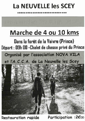 | Le 29/06/2025 à Neuvelle lès Scey (La) Balade en forêt Marche de 4 ou 10 kms dans la forêt de la Vaivre Venez vous balader dans la forêt des Princes de Bauffremont Après la marche vous pourrez vous restaurer sur la place du village de La Neuvelle Les Scey Buvette et restauration sur place Organisé par l'association Nova Vila et l'ACCA de la Neuvelle Les Scey Tarif : 2¤ Dimanche 29 Juin de 9h à 18h Lieu : Forêt de la Vaivre ( Bois du Prince) et place du village; Chalet du Prince Contact : 03 84 92 75 38 Email : la-neuvelle-les-scey@wanadoo.fr |